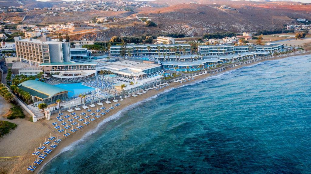 Arina Beach resort as the name suggests has its own private sandy beach, overlooking crystal blue seas in Kokkini Chani in the Heraklion area of Crete. The Winner of the Traveller's Choice award in 2022, a Tui global hotel award. and displaying a Green Key ecolabel , the resort has 4-5 review rating on TripAdvisor and is popular with families and couples.