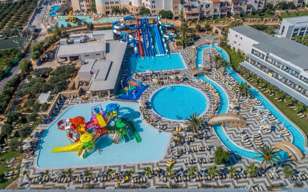 This lovely resort designed with elements of a Cretan village has won environmental awards. Overlooking a bay and a local village, families can sit and eat breakfast looking out to the ocean, then enjoy choosing from whole host of activities - from relaxing around one of the 6 swimming pools, to sports and watersports, or whizzing down the water slides ! There's even an indoor pool and fitness centre, spa, and boutique shops to look around... fun for all the family.